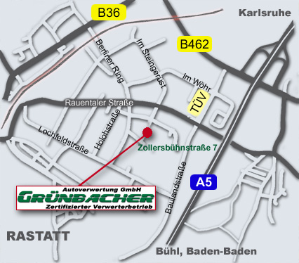 Über die B462, dann links in die Baulandstrasse abbiegen. Am Kreisverkehr geradeaus und am TÜV Rastatt vorbei bis zur nächsten Ampelanlage. An der Ampelanlage rechts in die Rauentaler Straße abbiegen. Nach ca. 300m links in die Zollersbühnstraße abbiegen. Sobald Sie auf der linken Seite zwei Baukräne sehen haben Sie Ihr Ziel erreicht. Von Westen bzw. aus Rastatt Über B36 Abzweig Ludwigring bzw. Berliner Ring in die Rauentaler Straße. Die Zollersbühnstraße geht direkt von der Rauentaler Straße ab. Sobald Sie auf der linken Seite zwei Baukräne sehen haben Sie Ihr Ziel erreicht. |